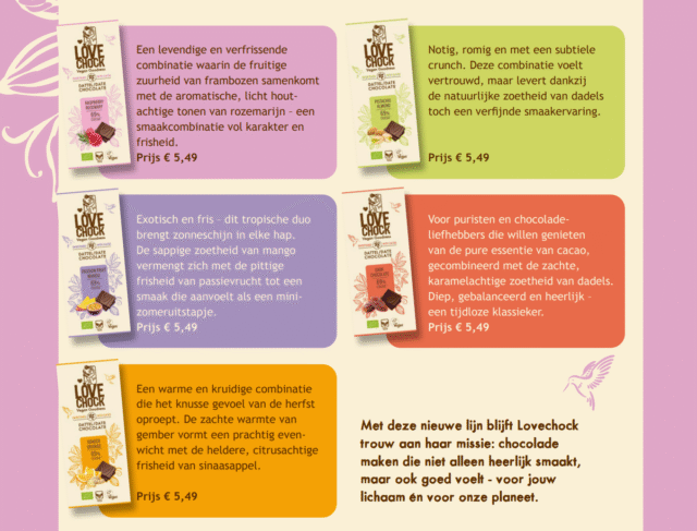 Lovechock kijkt verder dan alleen smaak. De cacao komt uit directe handel met boerderijen in Ecuador en de verpakkingen zijn composteerbaar. Daarmee voelt het extra fijn om juist dit soort chocolade cadeau te doen of zelf in huis te halen. Bewust genieten, zonder dat het belerend wordt.