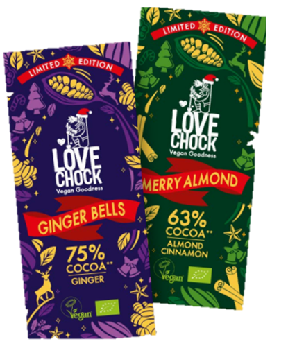 Speciaal voor de feestdagen lanceert Lovechock ook twee feestelijke limited editions. Deze repen bevatten 30% minder suiker dan gewone chocolade en zijn gezoet met inuline, een natuurlijke vezel uit de agaveplant die goed is voor je spijsvertering en zorgt voor een lichte karamelsmaak.